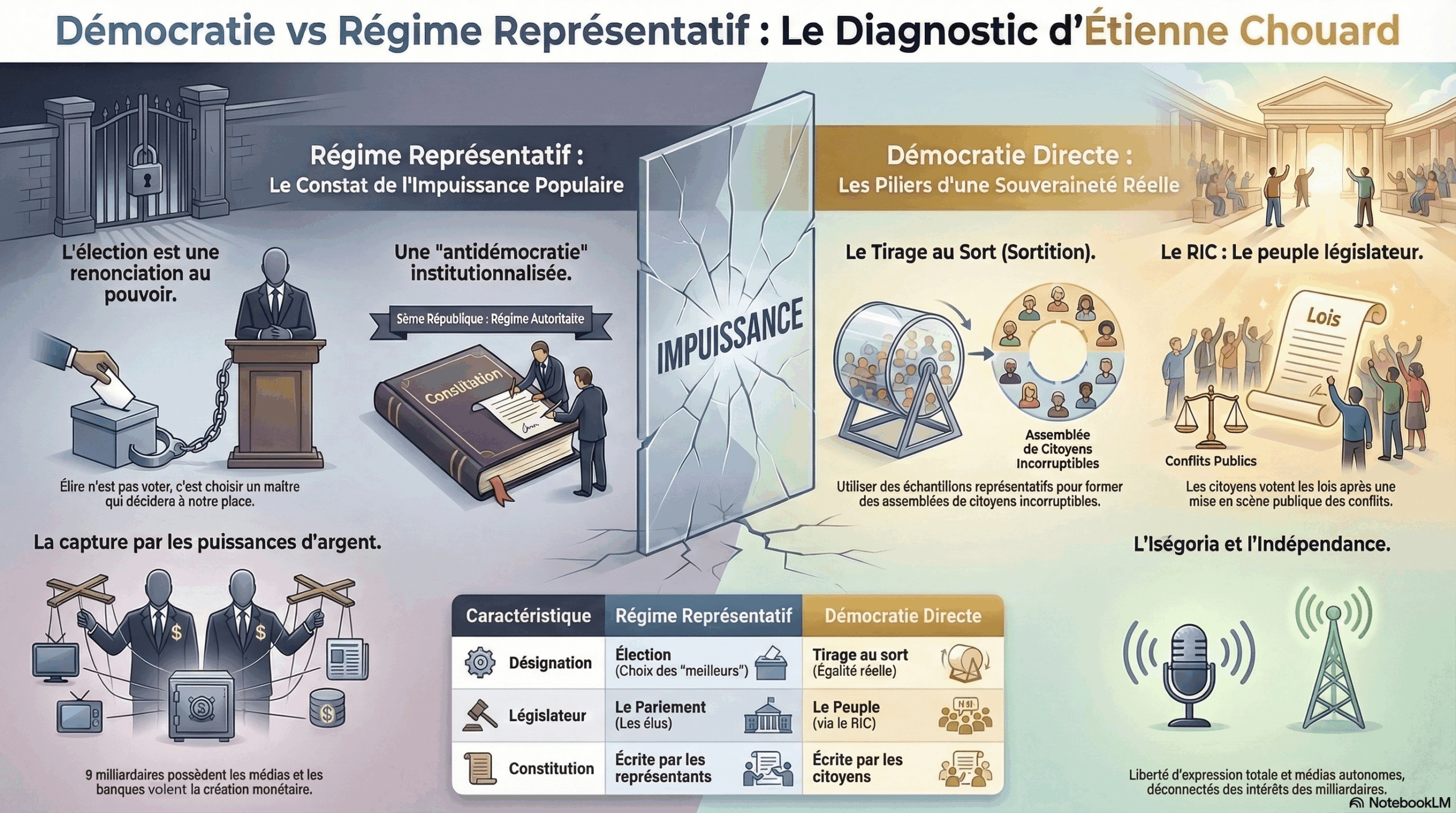 Ce texte présente un entretien entre l’avocat David Guyon et le militant politique Étienne Chouard portant sur une critique radicale de la Vème République. L’invité soutient que le système actuel n’est pas une démocratie mais un régime autoritaire où l’élection sert à écarter les citoyens du pouvoir législatif au profit d’une caste. Pour y remédier, il préconise l’instauration du Référendum d’Initiative Citoyenne (RIC) et le recours au tirage au sort, qu’il considère comme les seuls outils capables de garantir une véritable souveraineté populaire. Le débat aborde également la nécessité de libérer les médias de l’influence des milliardaires et de redonner à l’État son rôle de créateur monétaire. Malgré les réserves de l’hôte sur les risques de dérives majoritaires, Chouard affirme qu’une population correctement informée et impliquée dans l’écriture de sa propre Constitution saurait protéger l’intérêt général.